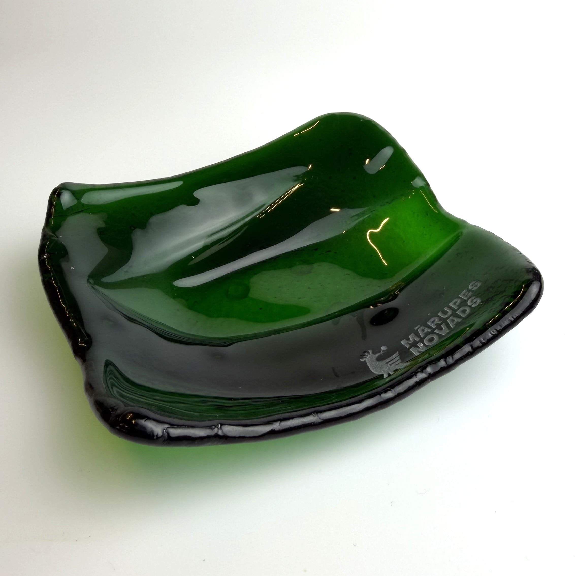 Stikla trauks ar logo, zaļš. Radīts Mārupes novadā, stikla dizaina studijā AM Studio.