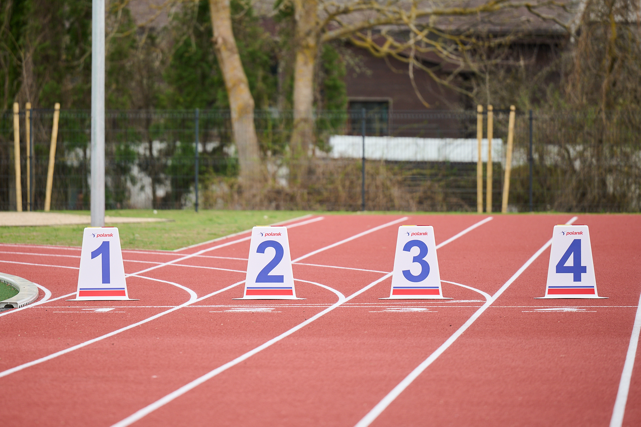 - sintētiskā seguma vieglatlētikas skrejceļš (300 m) ar trīs skriešanas celiņiem un četriem skriešanas celiņiem taisnē (100 m);